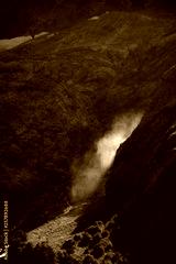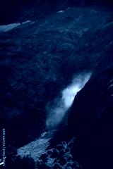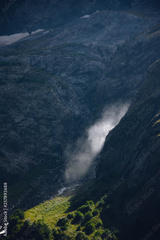 Large splashes from the waterfall in the distance are illuminated by the rays of the sun around everything in the shade. The Caucasian mountains in the surroundings of dombai are in the clouds.