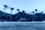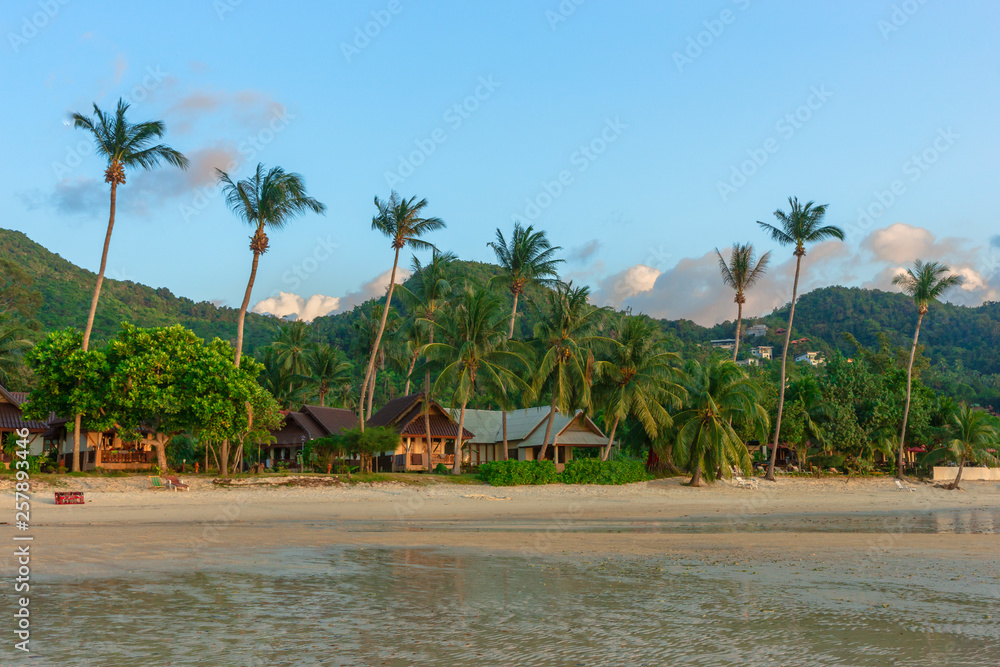 Tropical sunset at a beach with a coconut palm trees in Phangan island Thailand