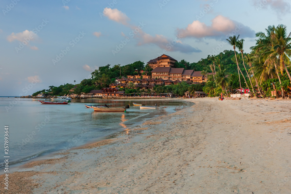 Romantic sunset on a tropical island with white sand beach at a luxury resort