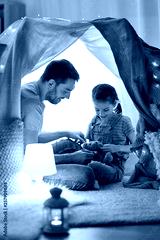 family, hygge and people concept - happy father with teddy bear toy and little daughter playing in kids tent at night at home