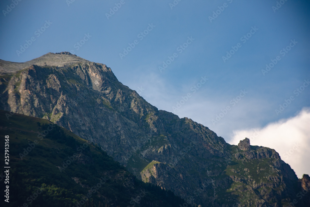 Large panorama Massive Caucasian mountains in the surroundings of dombai in the clouds. Summer day.