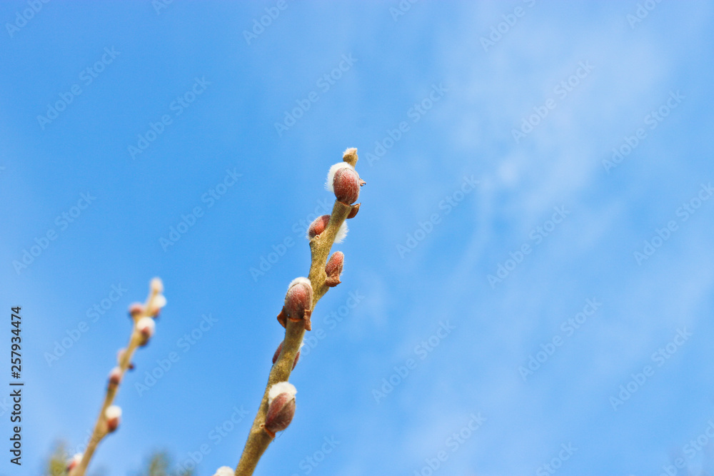 Blooming willow against the blue sky. Palm Sunday, Easter