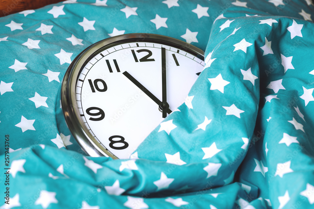 Big wall clock on a pillow in a bed showing 11 o'clock. Daylight saving time concept or sleep disorder insomnia