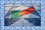Typical portuguese floor made of small pieces of black and white stone with flag and blue azulejos - portuguese culture concept