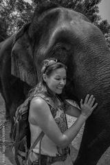 Tourist Woman poses with adult elephant