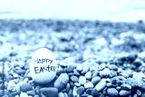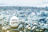 Easter egg from a stone with the inscription Happy Easter on the sea pebble beach, toned. Easter background