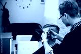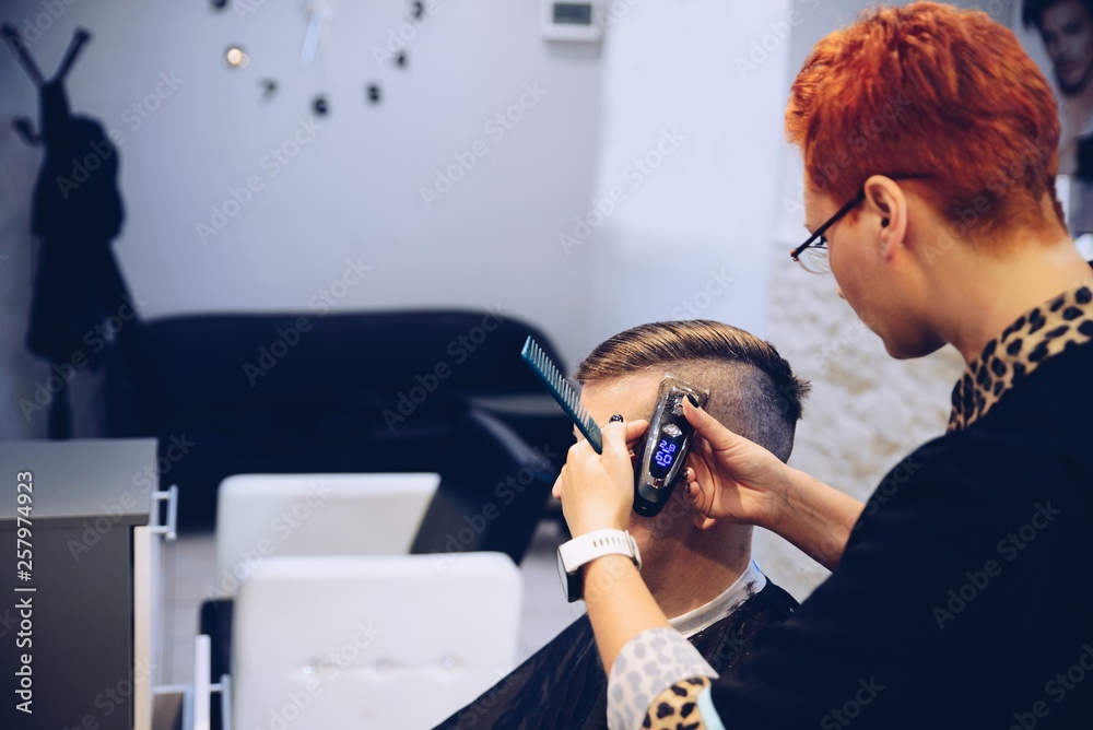 Woman hairdresser cutting male customer hair with electric trimmer.