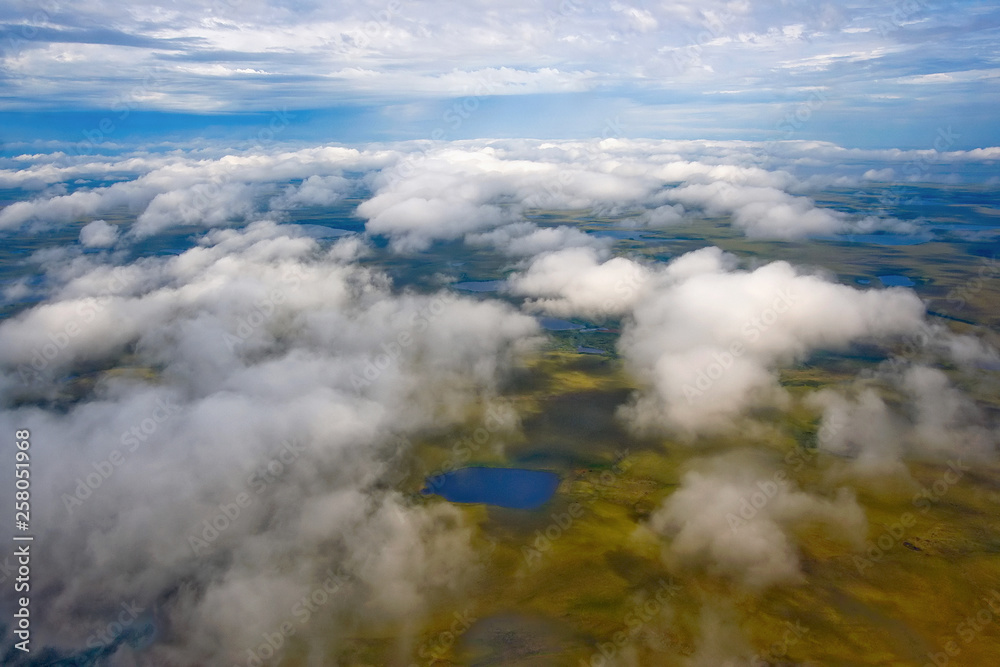Flying in the sky above the clouds. Aerial photography. View of the tundra with small lakes. Arctic nature. Chukotka, Siberia, Far East of Russia.