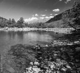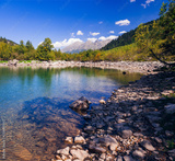 A huge panorama of the High-mountainous Baduk lake among the high Caucasian mountains and beautiful trees. Sunny summer day.