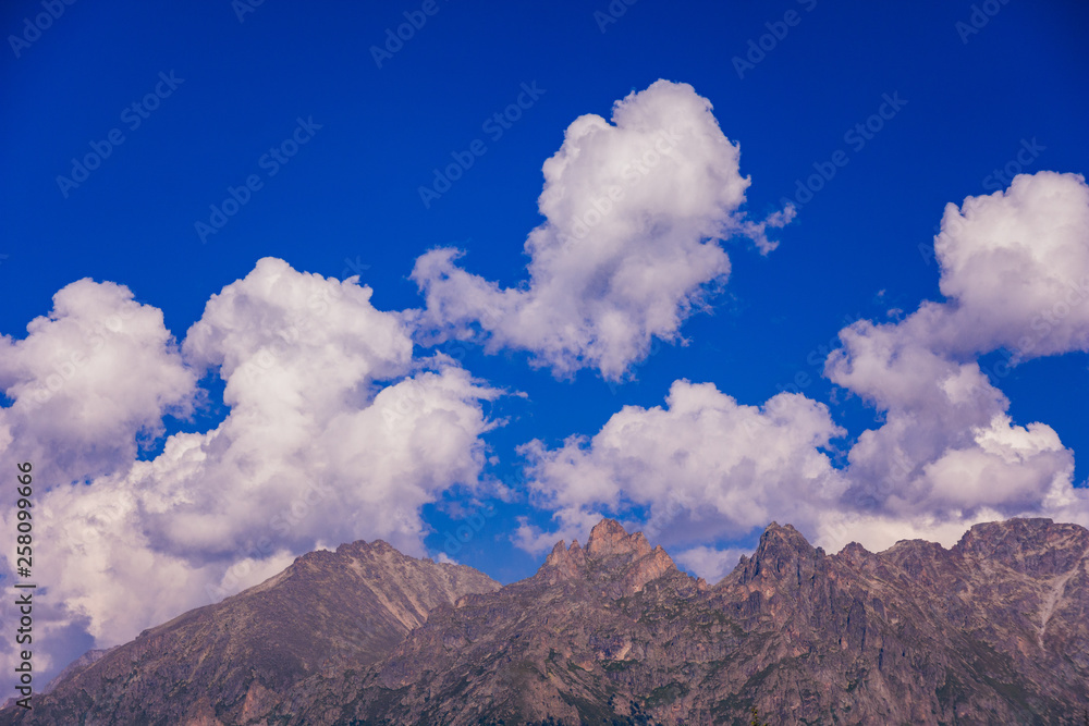 A huge panorama of high Caucasus mountains and beautiful trees on a sunny summer day.