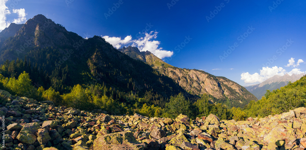 A huge panorama of high Caucasus mountains and beautiful trees on a sunny summer day. A very large amount of stones.