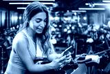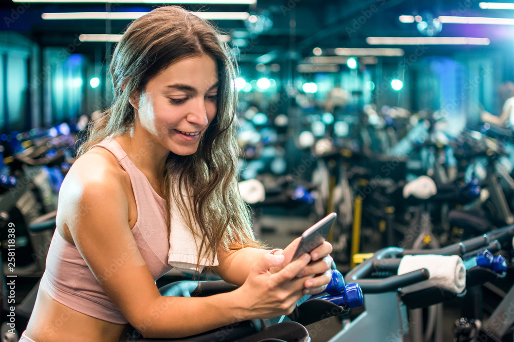 Smiling young sportswoman using smartphone during training break in cycling studio