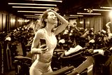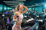 Cheerful and joyful sporty woman with earphones enjoying music on smart phone after sports training in cycling studio