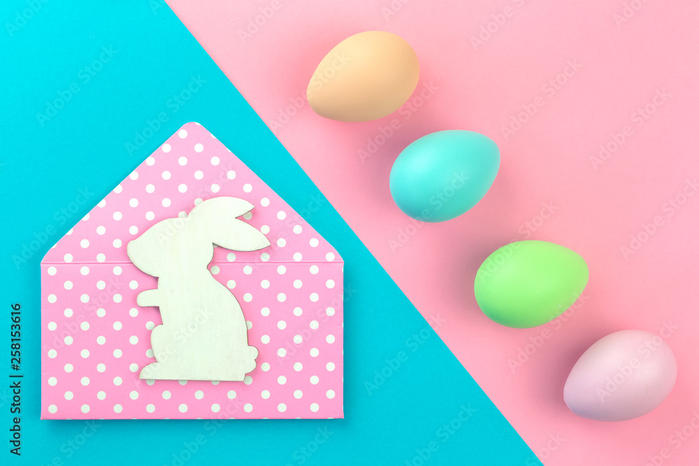 Colorful tender pastel easter eggs lined on pink and polka dot envelope with white bunny on blue background in flat lay with copy space