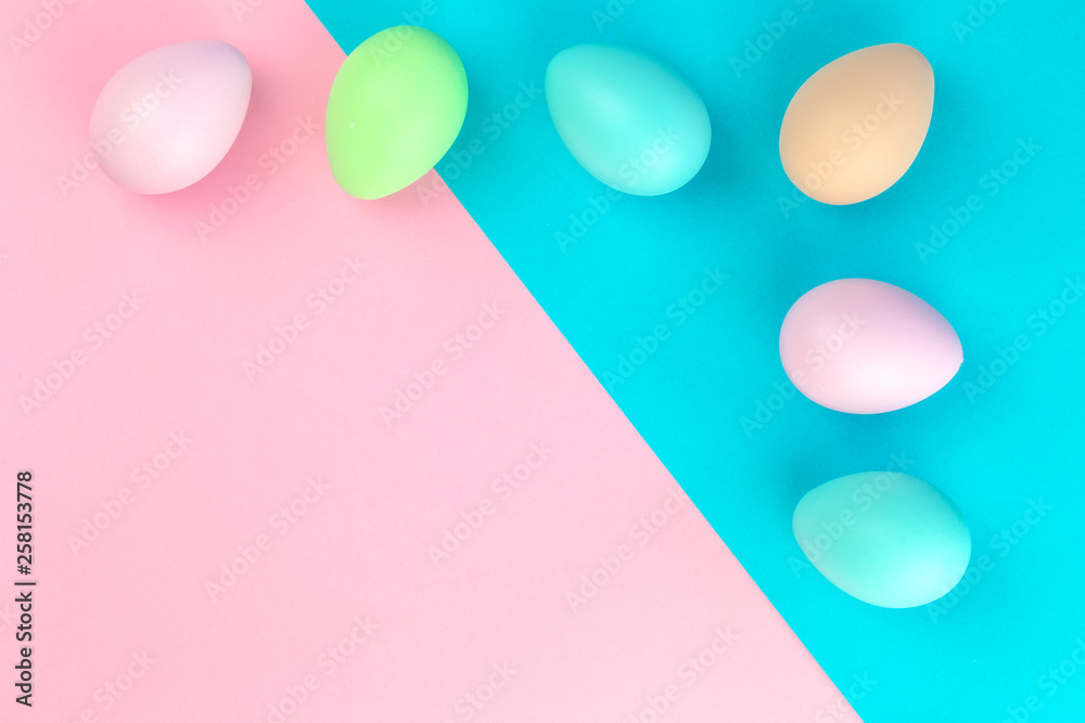 Colorful tender pastel easter eggs lined on pink and blue background in flat lay with copy space