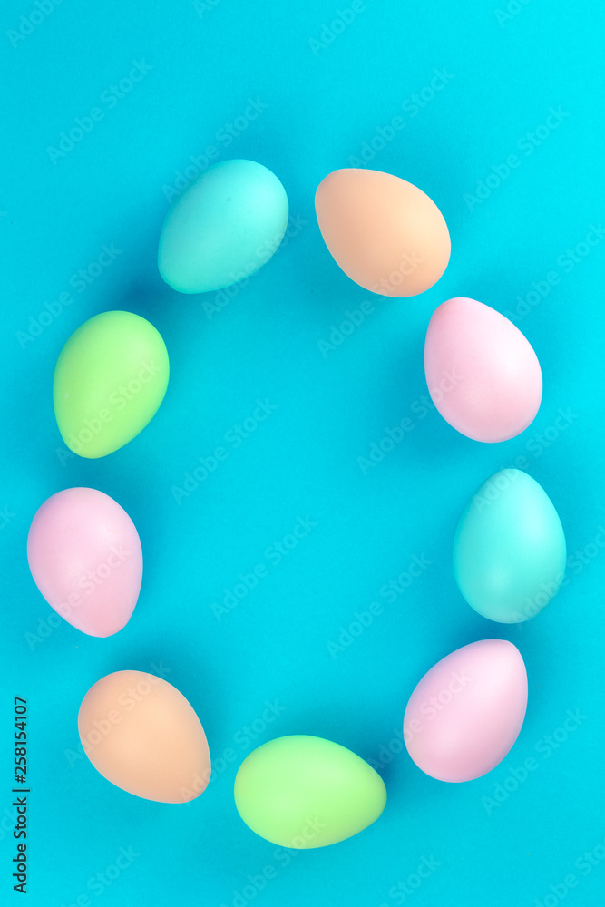 Colorful pastel easter eggs form egg shape with bunny on blue background in flat lay with copy space