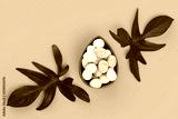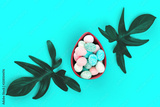 Happy Easter greeting card with small eggs in an egg shaped bowl and carved green leaves, on trendy mint background. Close up with copy space