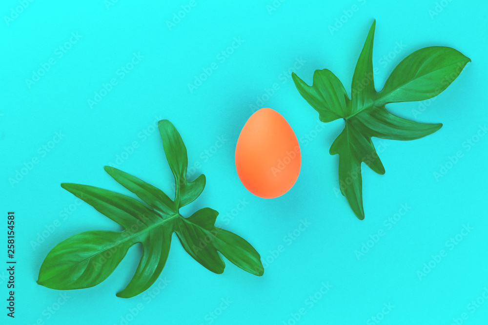 Happy Easter greeting card with egg and carved green leaves, on trendy mint background. Close up with copy space