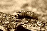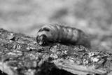 Raupe eines Weidenbohrers (Cossus Cossus) auf der Rinde eines Baumes