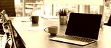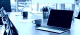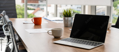 Laptop computer with opened lid on table in meeting room of office workspace.
