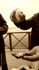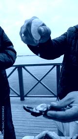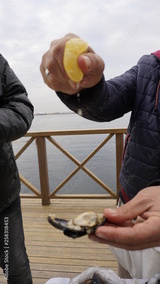 Eating stuffed mussel at seaside in Konak (Alsancak), Izmir. Popular traditional raw fresh food as known in native language "Midye Dolma". Selective focus.