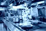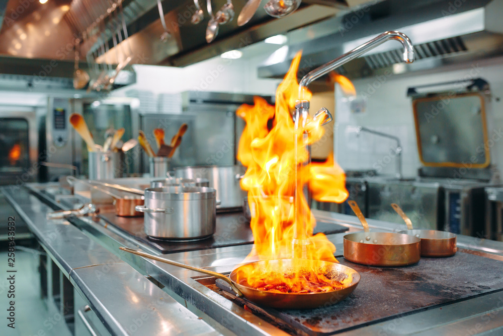 Modern kitchen. Cooks prepare meals on the stove in the kitchen of the restaurant or hotel. The fire in the kitchen.