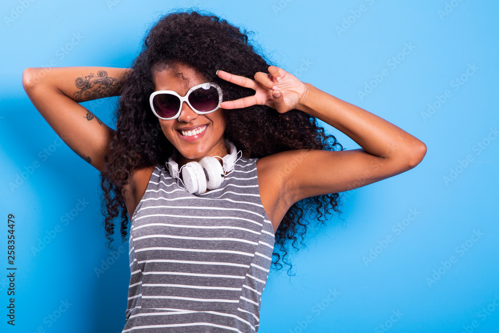 Portrait of cheerful positive woman having headphones dancing isolated on blue background