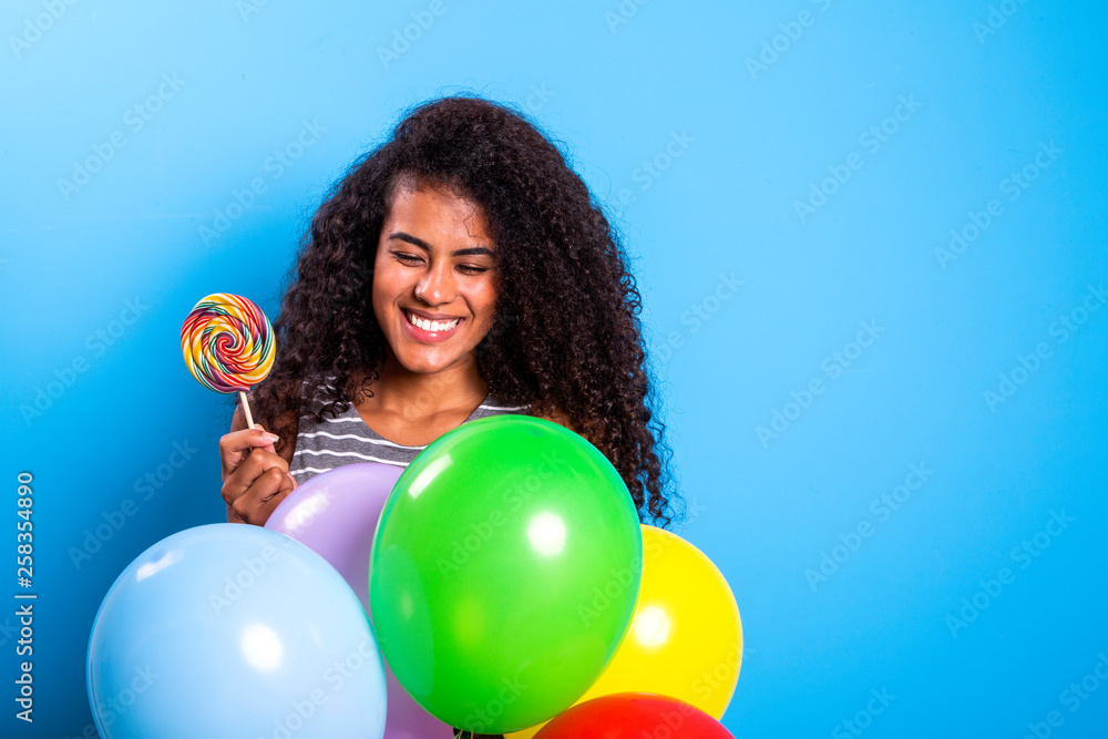 Portrait of beautiful african Woman having fun with sweet lollipop and baloons. Isolated blue background