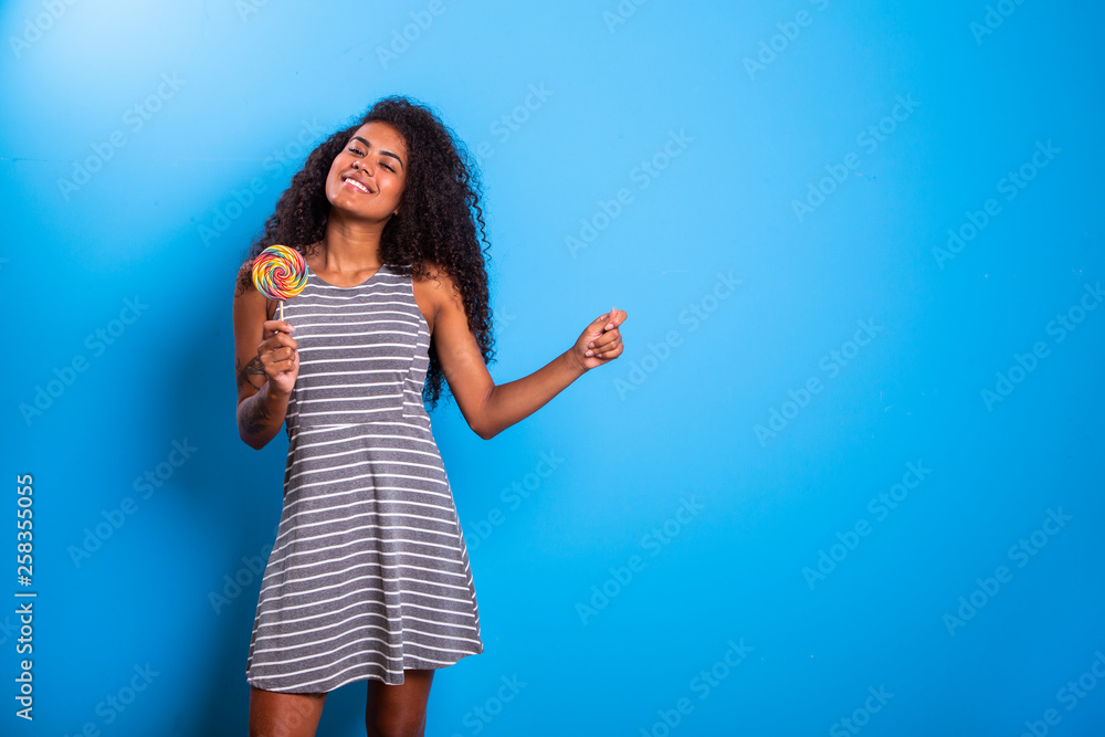 Smiling curly african girl in bright white t-shirt holding candy lollipop. Young cheerful woman hiding front face with lollipop at green studio background, copy space. Sweet life and confectionary