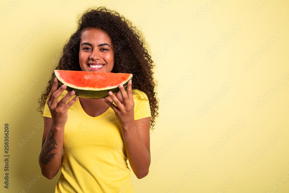 Pretty young girl holding slice of watermelon in front of her face. Portrait of smiling african american girl isolated on yellow background. Healthy & Happy