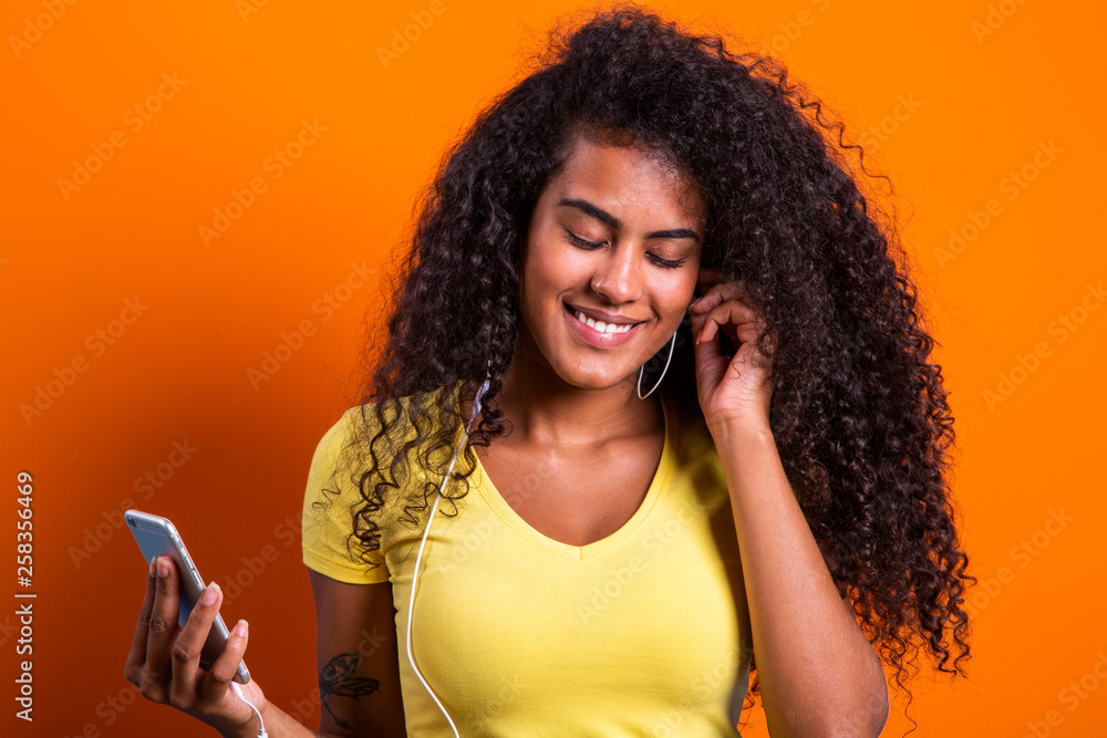 Charming amazing afro american young woman, dancing while listening to music in headphones on her mobile phone. Dressed in yellow blouse. Orange background.