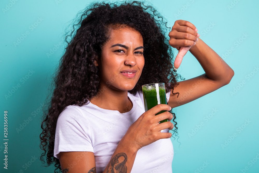 Disgusted africanwoman tasting a vegetable juice with bad flavor on green background