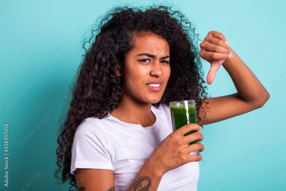 Disgusted africanwoman tasting a vegetable juice with bad flavor on green background