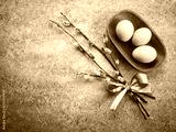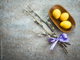 Happy Easter greeting card, copy space. Colored Easter eggs in wooden plate on the stone background. Easter concept.