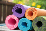close up of colorful yoga mat on the table, sport and healthy concept