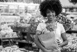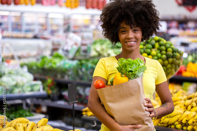 Healthy positive happy african woman holding a paper shopping bag full of fruit and vegetables