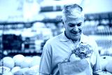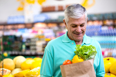 Healthy positive happy brazilian man holding a paper shopping bag full of vegetables.
