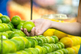 Woman's hand choosing lemons in supermarket