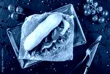 Fresh sandwiches with ham, cheese, bacon, tomatoes, lettuce in plate on dark stone background. Healthy lunch