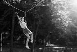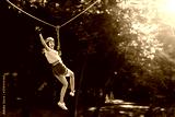 Happy women girl female gliding climbing in extreme road trolley zipline in forest on carabiner safety link on tree to tree top rope adventure park. Family weekend children kids activities concept