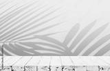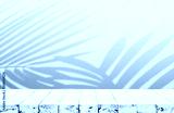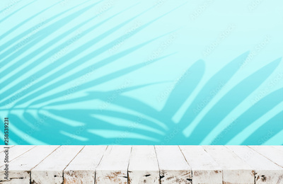 Summer and nature product display with wood table counter on blur coconut leaf background in blue color