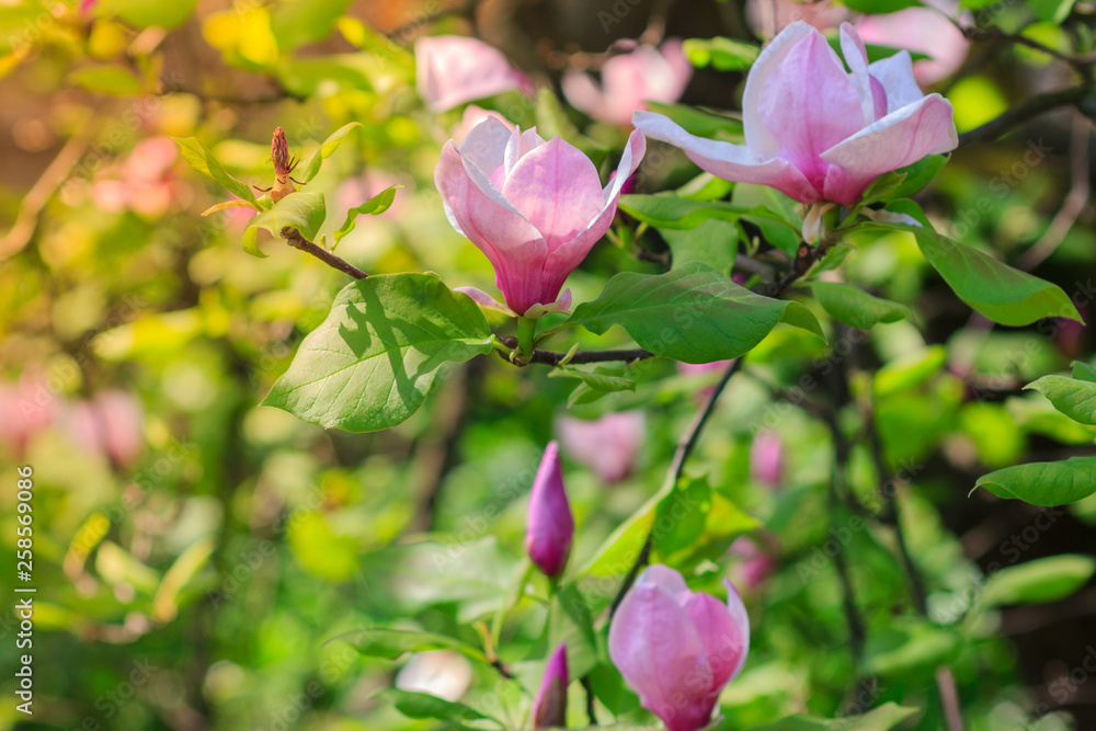 Spring awakening. Beautiful violet magnolia`s blossom. Nature background.