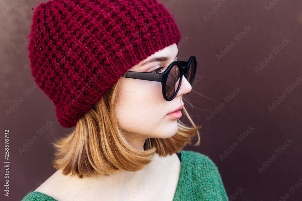 Modern young woman in a big city. Portrait of fashionable teenager girl in sunglasses and knitted hat