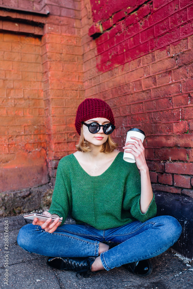 Beautiful stylish woman sitting on city street with legs crossed on summer day and holding mobile phone and coffee