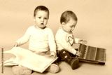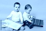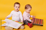 Twins sisters reading books while sitting on floor at home, charming girls playing while their mommy cooking breackfast, girls want to hear fairy tale. Happy family and little children concept.