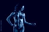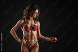 Perfect body Fitness woman bodybuilder in red bikini hold red apple isolated posing over black background in studio. Beautiful sporty girl fitness bikini model.