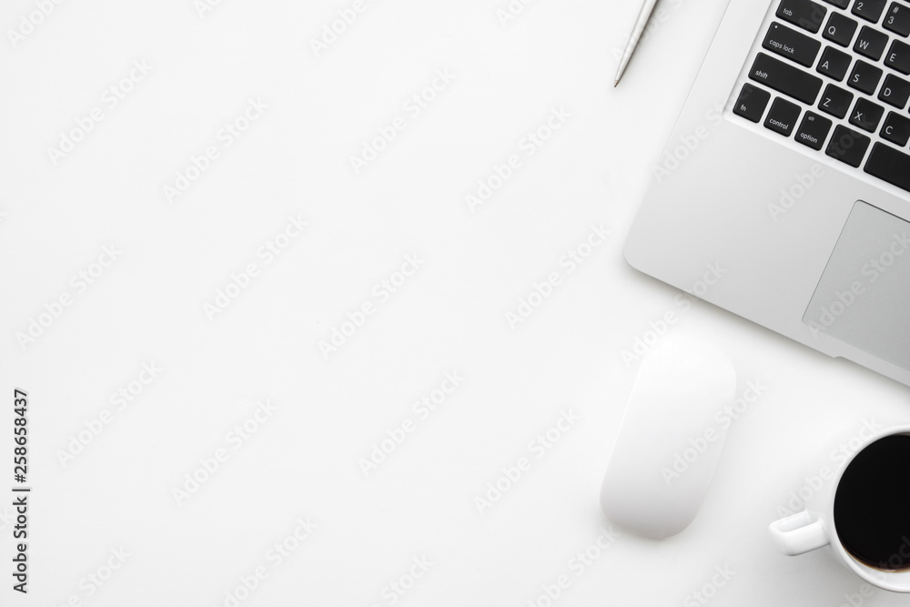 Modern white office desk table with laptop computer, coffee cup and supplies. Top view with copy space, flat lay.