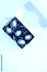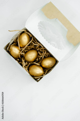 Golden Easter Eggs in a box with golden stars on white background . Easter Holiday concept abstract background copyspace top view