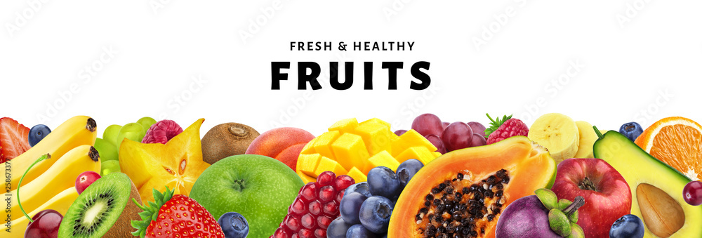 Assortment of exotic fruits isolated on white background with copy space, fresh and healthy fruits and berries close-up
