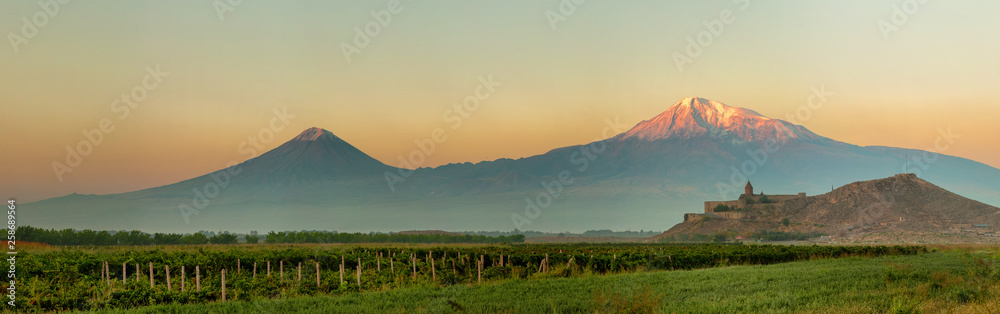 Ancient Armenian church Khor Virap with Ararat, Armenia. Panorama